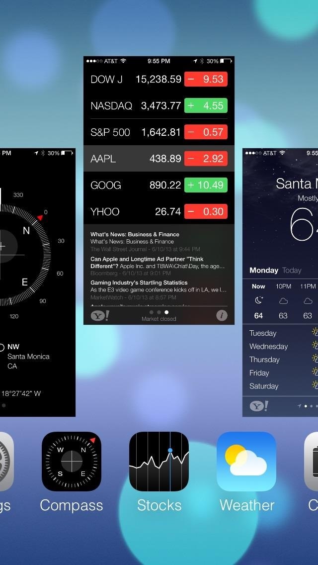 First thing to do is to double-tap your home button, this will bring up the multi-tasking view, then swipe up on the screenshot of the app you want to exit. The app will fly off the screen, this meaning it was closed and the amount of resources used has been reduced.